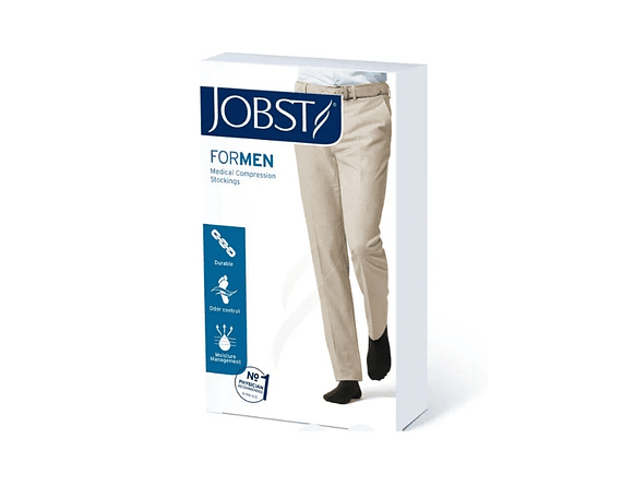 Calcetines de Compresión 15-20 mmHg JOBST For Men de color negro hasta el Muslo. Son calcetines de compresión de grado médico, para la prevención y tratamiento del paciente con insuficiencia venosa crónica, desde piernas cansadas o pesadas, presencia de arañitas vasculares, venas varicosas, edemas, cambios de coloración de la piel, hasta úlceras venosas cicatrizadas (desde etapa C0 A C5), diseñados especialmente para los hombres activos que ayudan a reducir los malestares y el dolor ocasionados por los problemas de circulación sanguínea. Están elaborados con tela liviana, tienen un acabado suave y cuentan con una banda en la rodilla que se ajusta a tu pierna brindándote una gran comodida