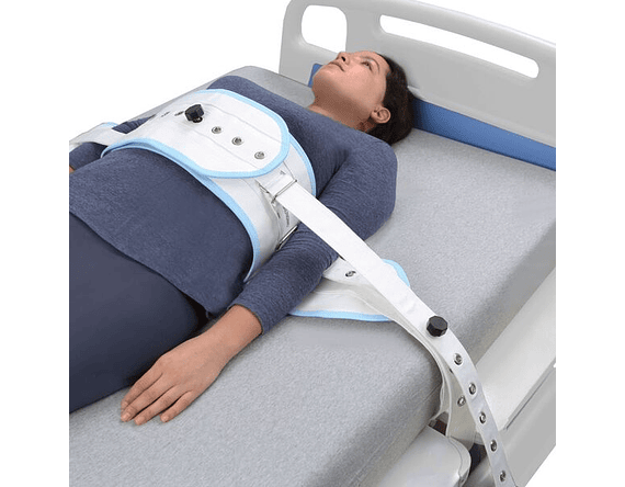 Contención de paciente, confeccionado por dos piezas en poliéster, una con banda inferior que se fija en los extremos de la cama y la otra de cinturón ajustable al paciente por medio de un sistema de cierre mediante botón magnético (Negro) y llave magnética (Rojo) más cierre de contacto. Cara interna y externa mismo material. Para la contención segura de pacientes desorientados, alterados o agresivos.