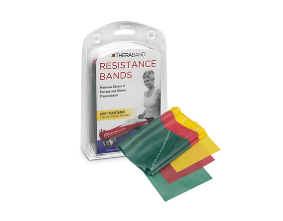 Kit de Bandas de Resistencia Liviana TheraBand, herramienta ideal para pacientes al momento de rehabilitar patologías musculoesqueléticas, fortalecimiento, mejorar la funcionalidad y el rendimiento deportivo. Fáciles de usar, cómodas y portátiles ofreciendo una excelente alternativa tanto en el hogar, gimnasio y centros de rehabilitación. Paquete de bandas ligeras de 1.5 mt de longitud. Amarillo de resistencia muy ligera 1.3 Kg, Roja de resistencia ligera 1.7 Kg y Verde resistencia moderada 2.1 Kg de resistencia al 100% de estiramiento.